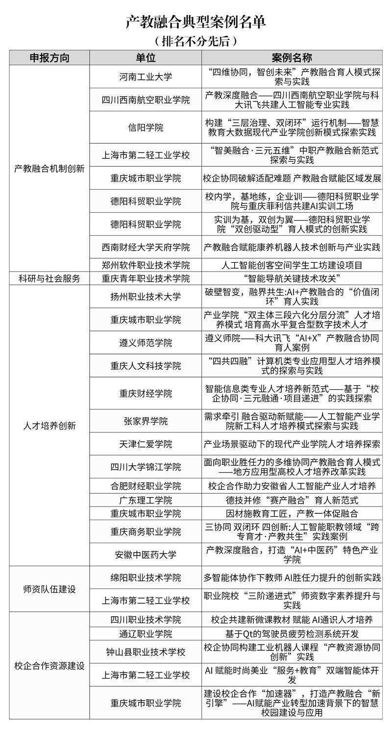 今年9月,科大讯飞股份有限公司、上海交通大学、重庆城市职业学院共同发起的全国人工智能行业产教融合共同体启动产教融合典型案例征集活动。经严格审查与联合评议,从156份申报案例中遴选出来自全国多家单位的30个典型案例,包括河南工业大学《“四维协同,智创未来”产教融合育人模式探索与实践》、四川大学锦江学院《面向职业胜任力的多维协同产教融合育人模式——地方应用型高校人才培养改革实践》等。